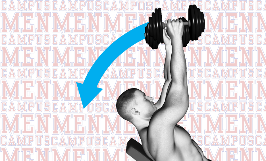 Keeping your core muscles tight, exhale as you allow the dumbbells to drop behind your head
