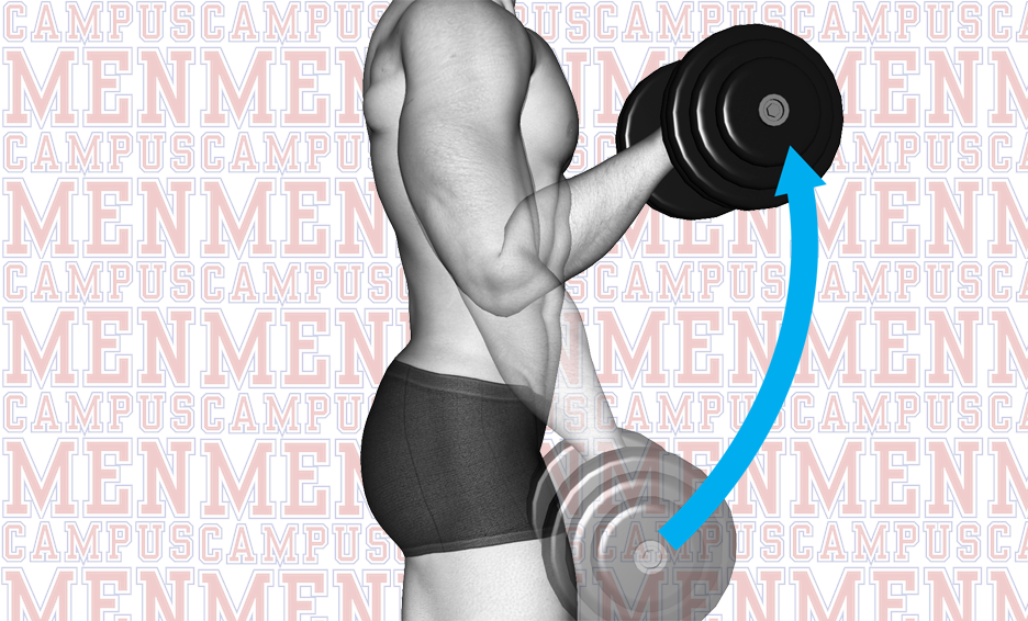 Maintaining tight core muscles and keeping your palm facing outward and downward, exhale while you flex your bicep muscle while curling the dumbbell upward towards your shoulder.