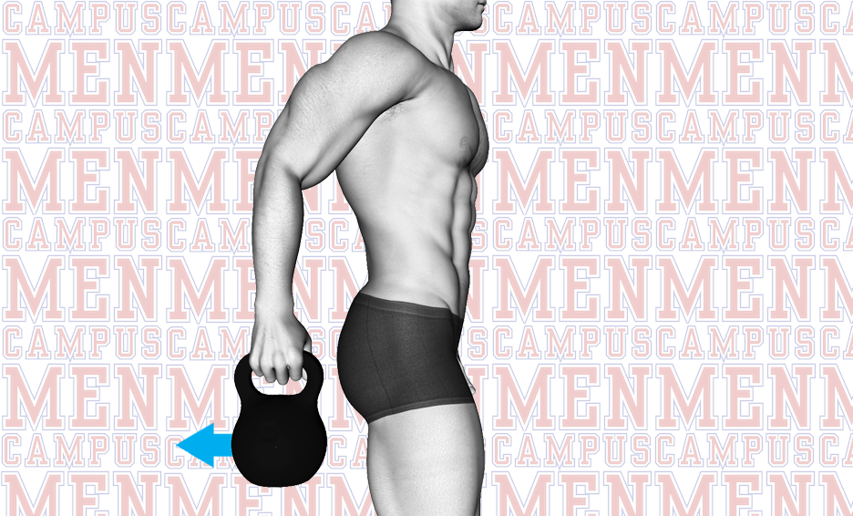 Using some force, exhale while you swing the kettlebell backward to build up momentum...