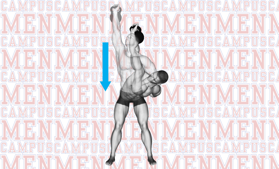 While keeping the arm holding the kettlebell straight up and behind you, lower your torso at your waist, until your torso becomes almost parallel to the floor.