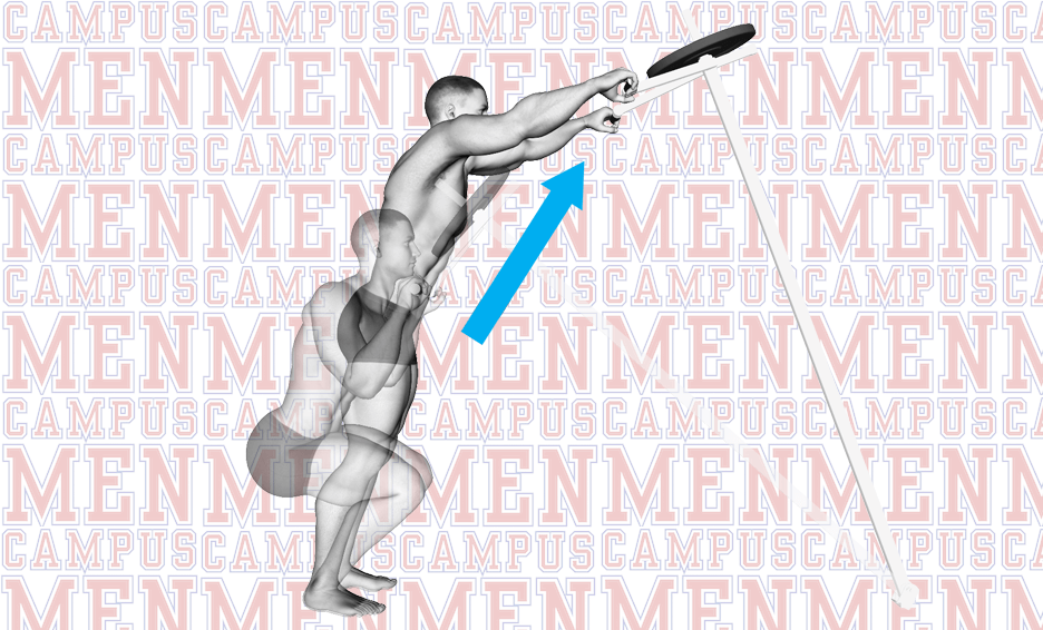 Exhale while quickly pushing the handles up and away from your body as high as you can reach, thrusting with your hips and knees.